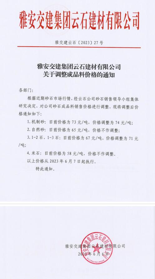 雅安交建集團云石建材有限公司成品料價格調(diào)整公告(2023-06-06)