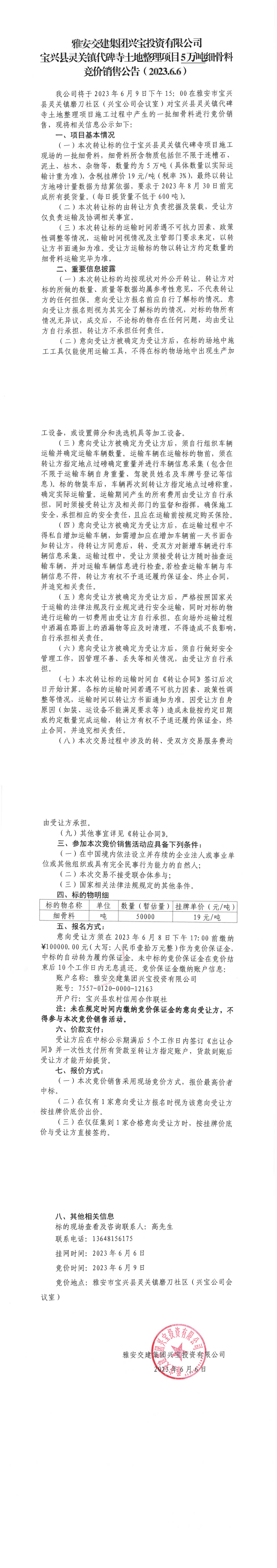 雅安交建集團(tuán)興寶投資有限公司寶興縣靈關(guān)鎮(zhèn)代碑寺土地整理項(xiàng)目5萬噸細(xì)骨料競價(jià)銷售公告(2023.6.6)