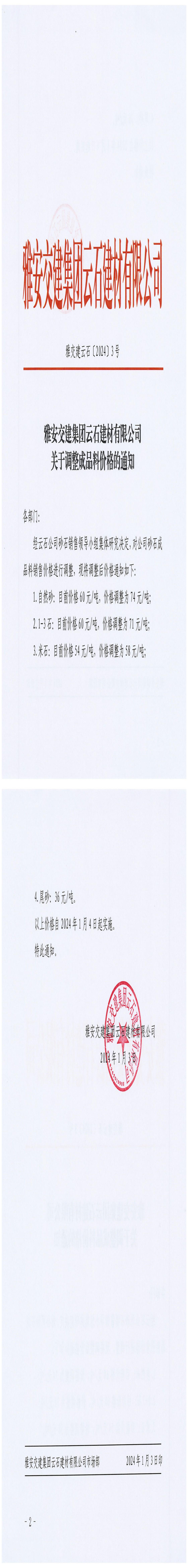 雅安交建集團云石建材有限公司成品料價格調(diào)整公告(2024-01-04)