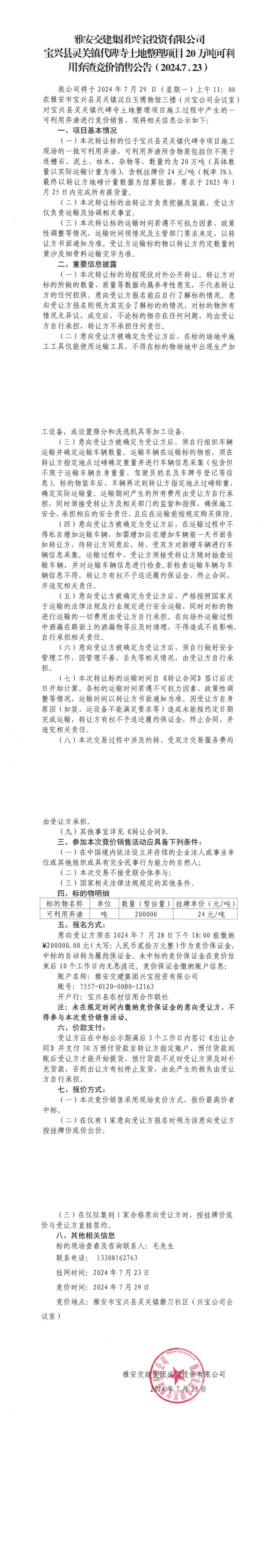 雅安交建集團(tuán)興寶投資有限公司靈關(guān)鎮(zhèn)代碑寺土地整理項(xiàng)目20萬噸可利用棄渣競價(jià)銷售公告(2024.7.23)
